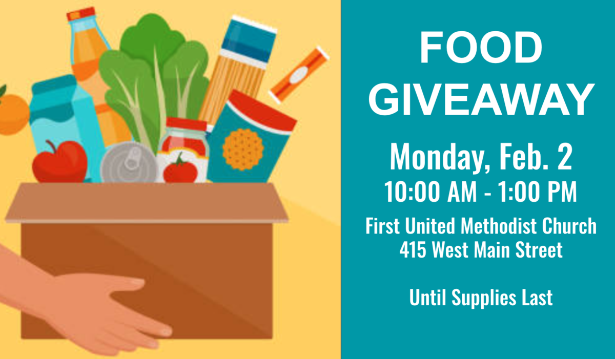 Free Food Giveaway - Monday, Feb. 2 at First United Methodist Free Food Giveaway - Monday, Feb. 2nd, 10am - 1pm at First United Methodist, 415 West Main Street or Until Supplies Last. Published January 30, 2026 Print